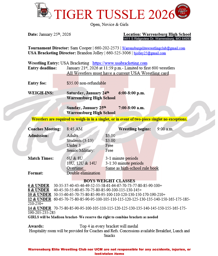 Tiger Tussle (USAW) Warrensburg High School 1411 S Ridgeview Dr Warrensburg, MO 64093 |